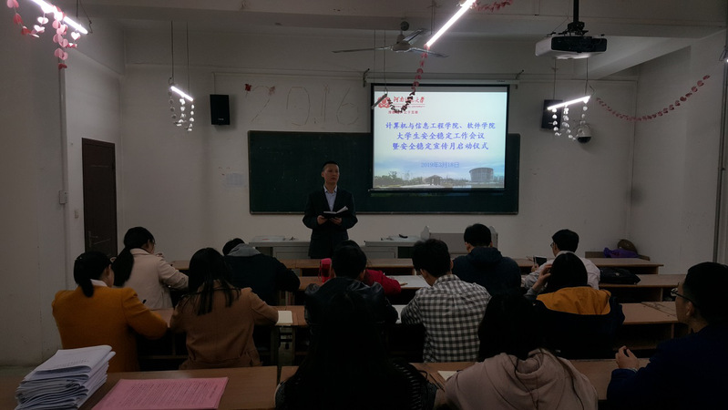 3月18日上午,计算机与信息工程学院、软件学院在计算机楼318教室举行大学生安全稳定工作会议暨安全稳定宣传月启动仪式,此次会议由学院党委副书记张东亮主持,各年级辅导员及主要学生干部参加了此次会议。