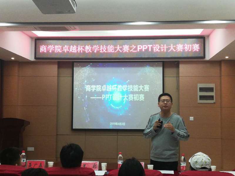 为提高广大青年学子基本软件应用技能,丰富学生校园文化生活,4月3日晚,商学院团委学生会网络部于院119报告厅举办了“卓越杯”教学技能PPT设计大赛院级初赛。院团委书记王岩、办公室副主任李建华、2018级辅导员聂广森受邀担任本次评委,商学院2018级部分学生到场观看了比赛。