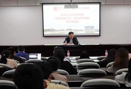 帮助学生明确考研目标、了解考研资讯、掌握考研学习技巧,5月10日下午,政治与公共管理学院举办考研专题辅导会,校党委副书记陈广文应邀出席并作专题报告,辅导会主会场设在勤政楼第四会议室,分会场设在东综327、思政平台和政管学院217教室。学院相关负责人、辅导员和700名学生代表听取报告。会议由学院党委副书记张瑾主持。