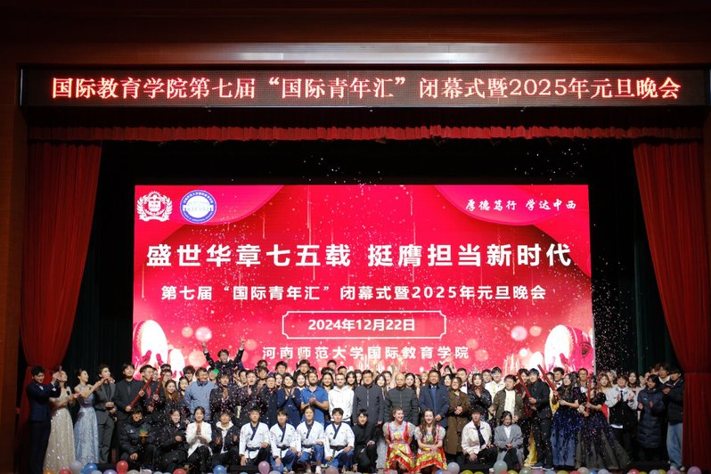灯火辉煌映青春,笑语盈扬贺元旦。12月22日晚,以“盛世华章七五载,挺膺担当新时代”为主题的第七届“国际青年汇”闭幕式暨2025年元旦晚会在河南师范大学附属中学金龙校区礼堂胜利举行,院抖音官方平台进行线上直播。学院领导班子成员、中外方教师代表和五百余名学子齐聚一堂,共享这场视听盛宴。