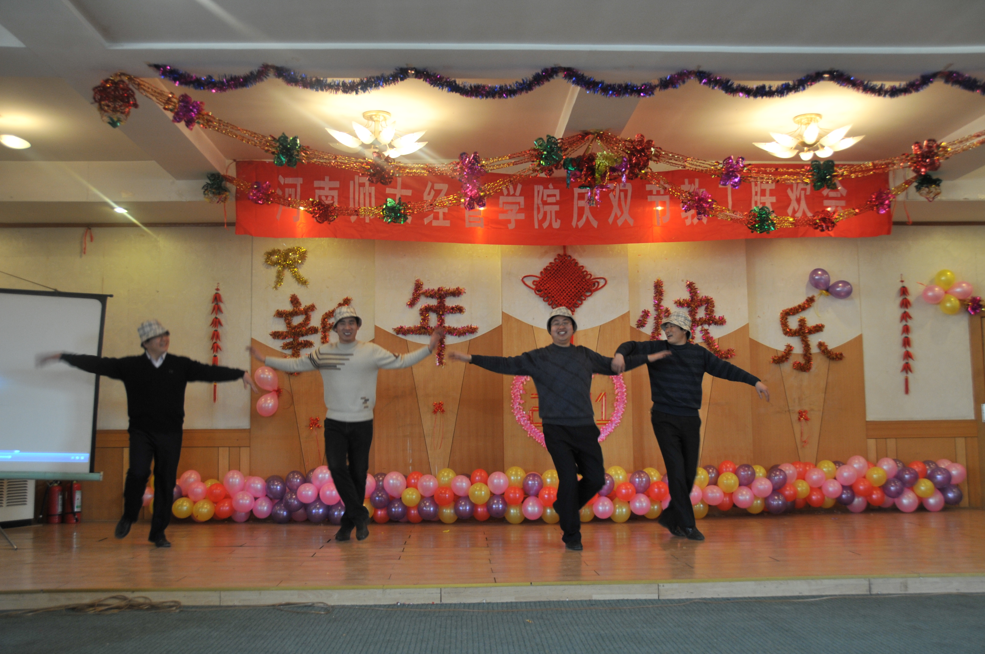 联欢会在国际贸易教研室主任丁祥生老师演唱的歌曲《大约在冬季》中拉开序幕。随后,精彩节目不断上演,掌声欢呼声不断。其中,歌曲《爱拼才会赢》、《歌唱祖国》表达了全体经管学院教职工们对河师大的祝福,以及对祖国的热爱;党委副书记李杰及辅导员老师精心排练的舞蹈《天鹅湖》博得现场的阵阵笑声;其他老师带来的节目也给整个联欢会带来了美好的艺术享受和浓浓的节日气息;节目中穿插的小游戏将现场气氛一步步推向高潮。最后,联欢会在管理学教研室的《团结就是力量》激情高昂的合唱声中落下帷幕。