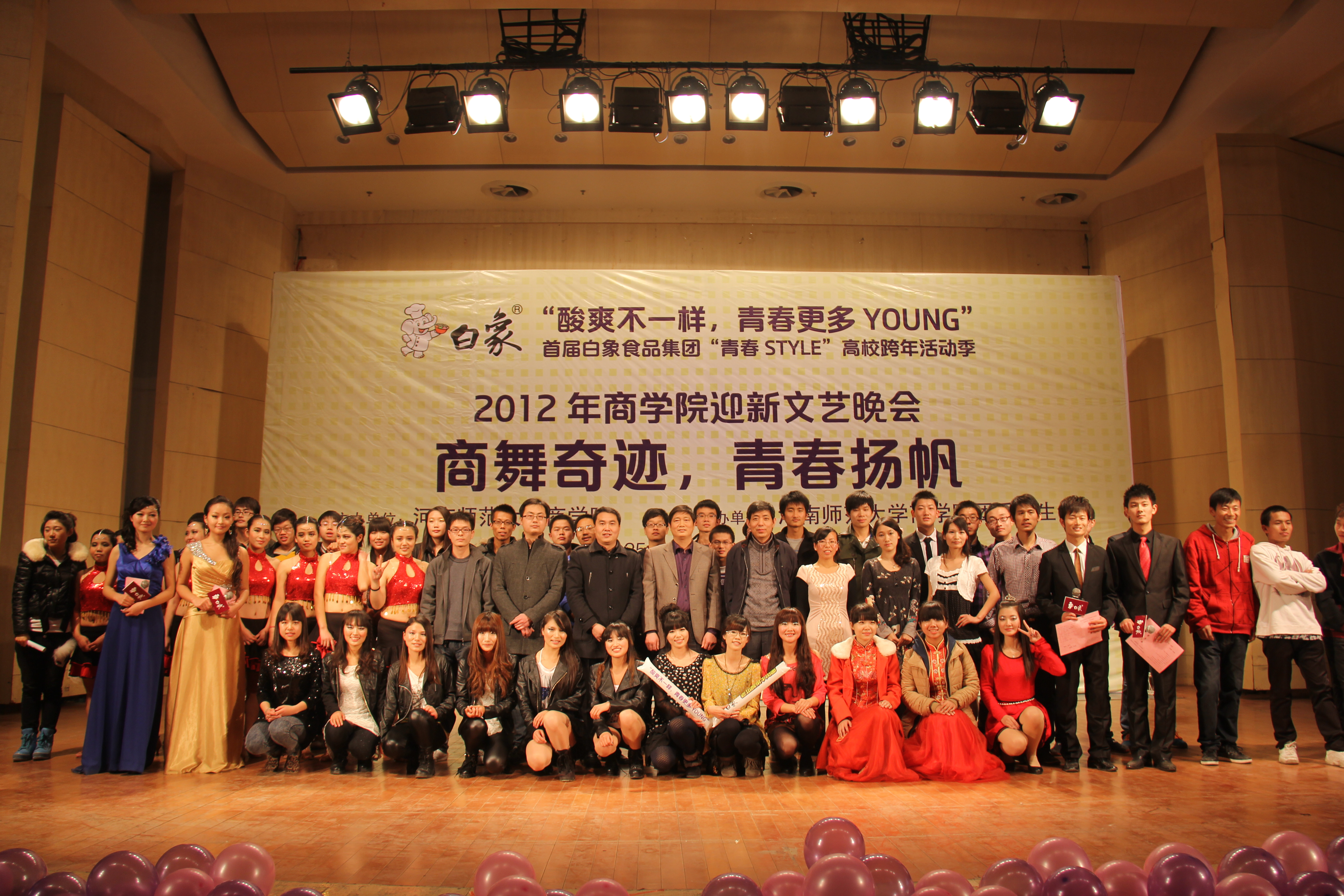 商舞之夜,炫彩大学。11月25日晚,商学院2012级迎新晚会在帕瓦罗蒂音乐厅隆重举行。润华置业总经理刘传辉、河南心连心化肥有限公司工会主席炎灿炬、河南鹏劳人力资源管理有限公司豫北区域总经理王雪等新乡CHO俱乐部的成员,校就业部指导服务中心主任马玉栋、音乐学院党总支书记孔国庆、校团委副书记李浩,商学院院长任太增、院党委副书记李杰、院教学院长刘新同等领导,各兄弟院系学生会主席应邀出席了此次晚会。商学院团委学生会全体成员携来自全校的800余名学生共同观看了此次盛会。