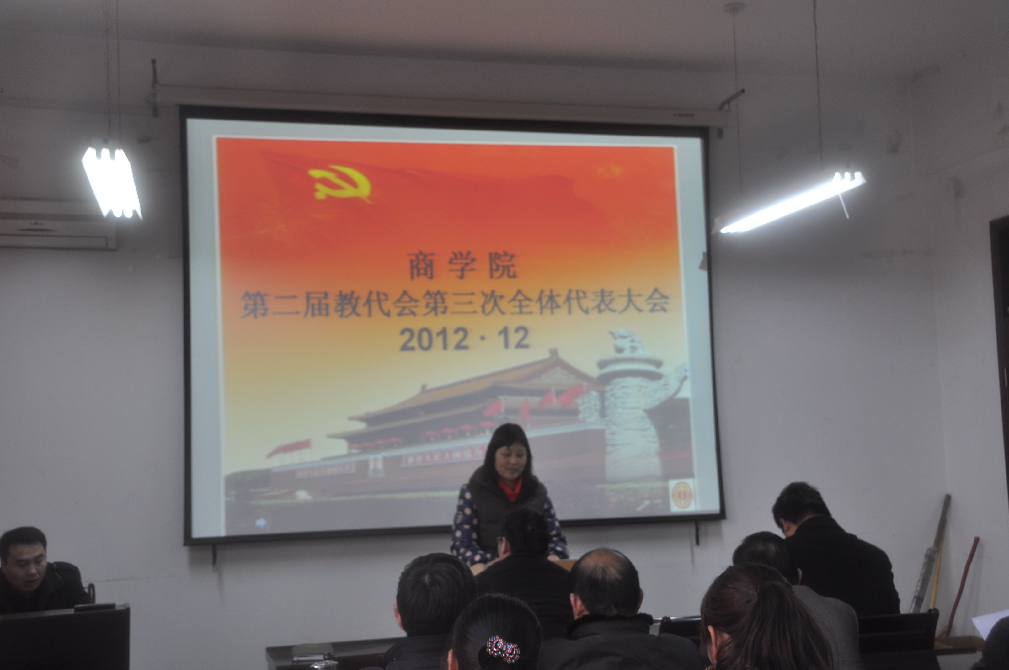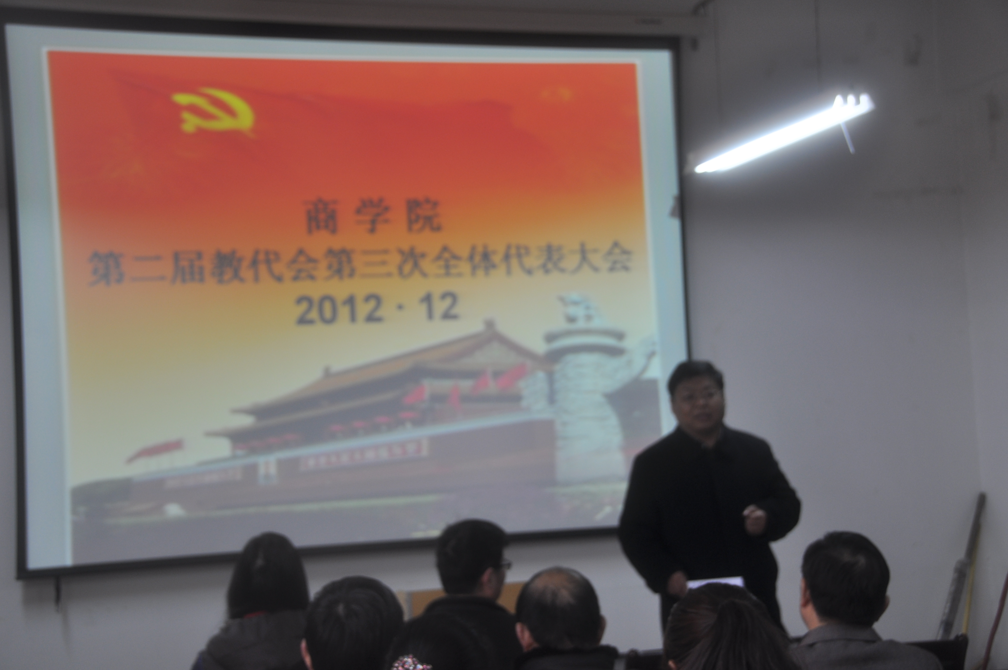 按照日程安排, 2012年12月11日下午2:30召开商学院二届三次教代会。会议由工会主席、院行政副院长纪晓红同志主持。在大会上,院长任太增同志作商学院2012年度的工作报告。经过到会人员讨论审议,表决通过了《商学院硕士研究生导师管理条例》和《商学院教学优质课比赛规定》,并形成了相关决议。院党委书记朱建同志采取发放问卷形式开展对新时期学院干部素质要求的民意调研。至此,商学院二届三次教代会按计划完成了预定的议程。在《国际歌》的乐曲声中结束会议。