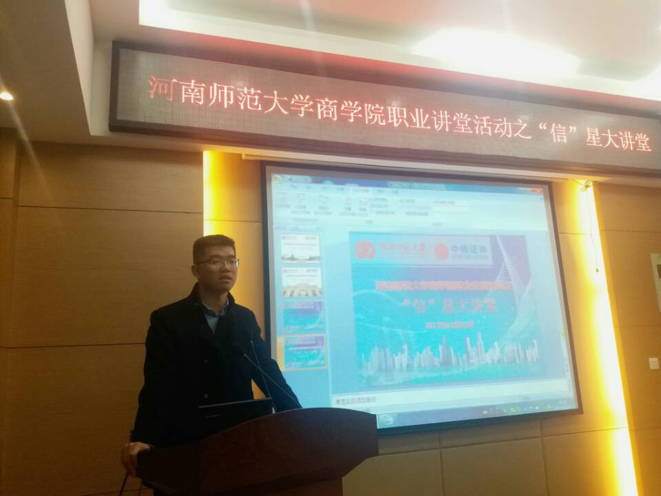 11月21日晚7时,我院联合中信证券举办的职业讲堂活动之“信”星大讲堂于商院楼119报告厅成功举行。学生处贷款科室科长朱进、中信证券新乡营业部总经理孙涛、我院团委书记王岩、2014级辅导员张安琪、中信证券新乡营业部副总经理雷永鹏以及优秀学生代表参加了本次活动,中信证券营业部靳亮和彭祎担任本次讲堂主讲人。