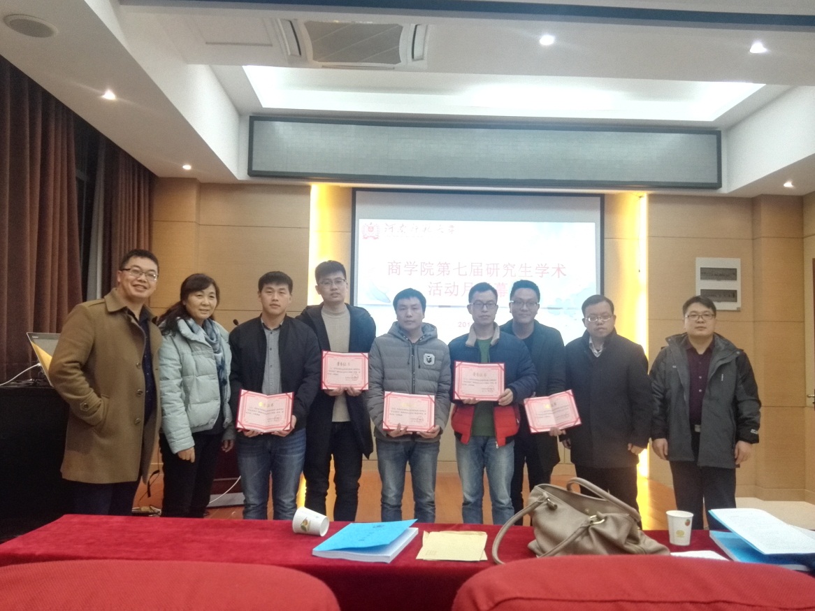 开幕式后,由荣获优秀论文称号的六名学生做主题报告,为大家展示自己的论文写作过程,分享研究成果。经过三个多小时的精彩报告后,通过评委小组(由科研院长乔俊峰教授、管理学学科带头人任鸣鸣教授、经济学学科带头人胡国恒教授、研究生工作秘书王喜刚教授以及科研秘书海本禄教授组成)评选出特等奖1名,一等奖2名和二等奖3名,获得特等奖的这名同学将代表学院参加学校的硕博论坛。闭幕式上,科研院长乔俊峰教授以及各评委老师为获奖同学颁奖,并与获奖同学合影留念。