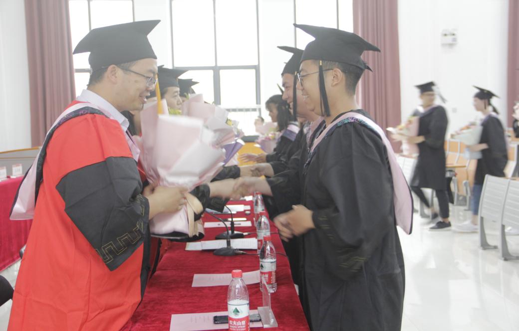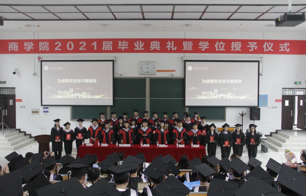 芳华六月,骊歌渐响。6月9日下午,商学院2021届毕业典礼暨学位授予仪式于文昌楼127教室隆重举行。学院党委书记李志前,院长杨玉珍,党委副书记马淑明,副院长陈清利、李荣华、海本禄、王喜刚,各教研室主任,教师代表,各年级专兼职辅导员及2021届全体毕业生参加了此次典礼。毕业典礼由马淑明主持。
