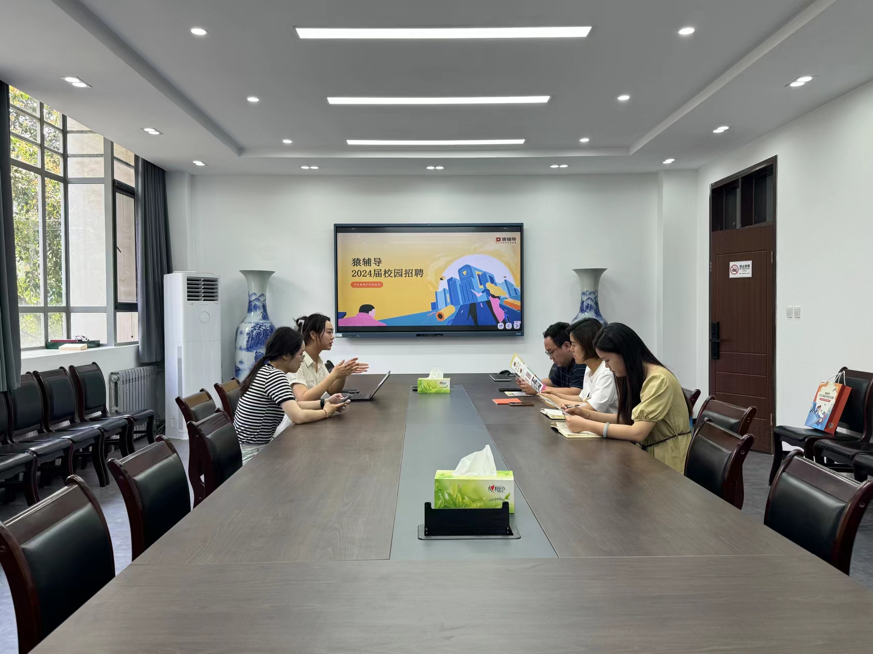 为全面深化人才供需对接,拓宽学生高质量就业渠道,6月13日,猿辅导来我院于学院224办公室举办校园专场招聘会。商学院党委副书记马淑明、团委负责人郭琛昊以及2020级辅导员赵玮参加此次会议,2024届毕业生代表通过线上方式参会。