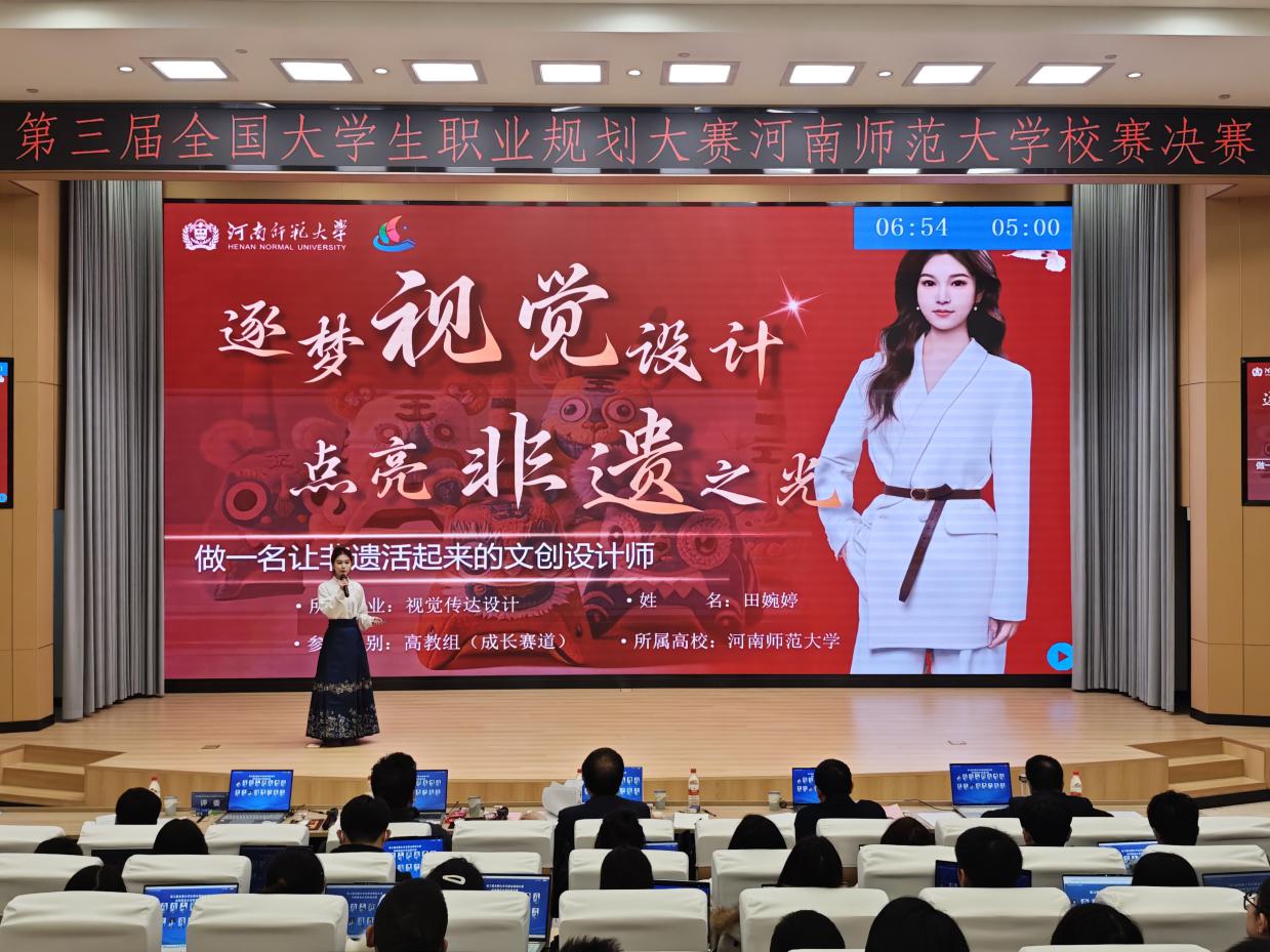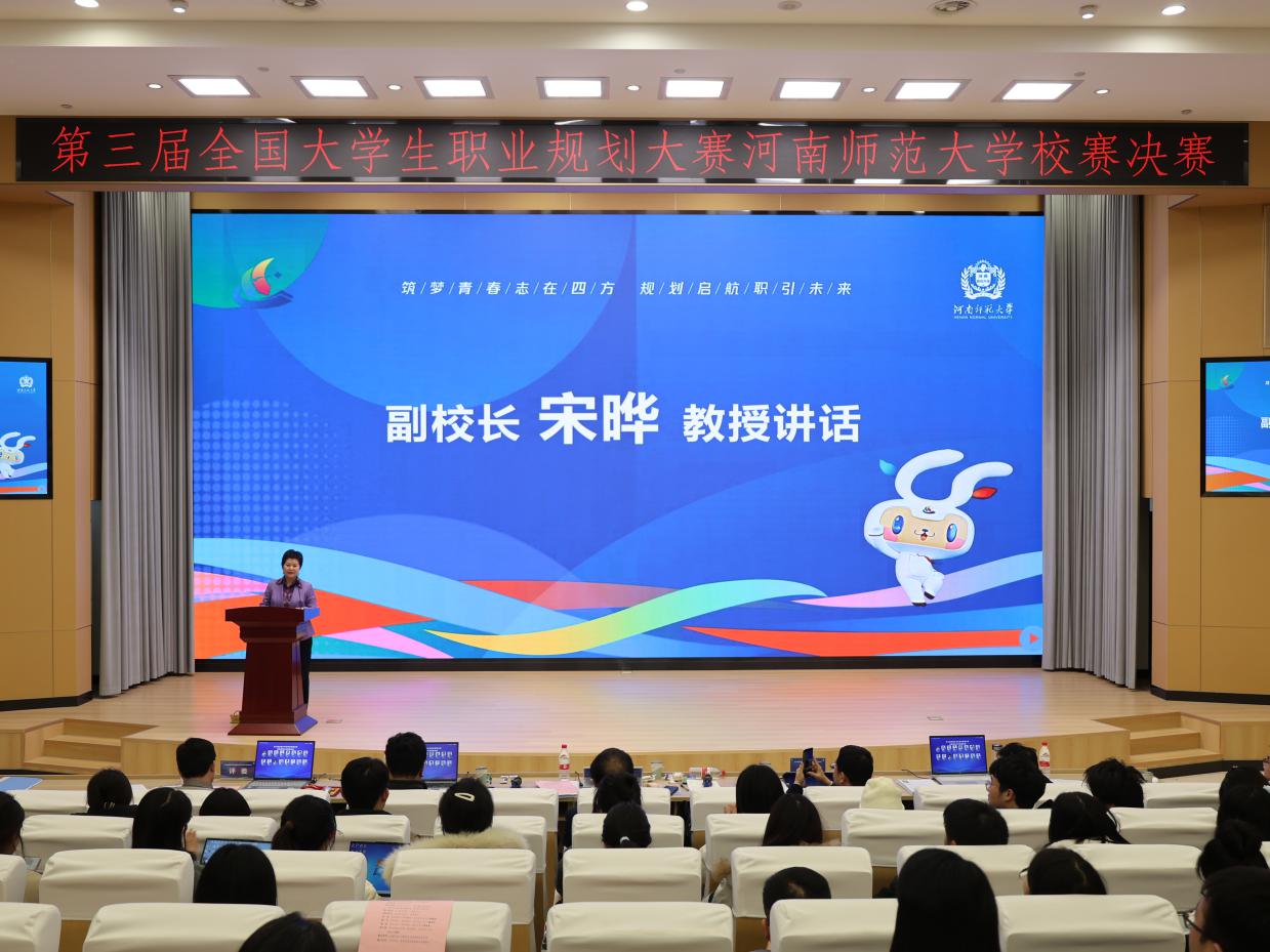 12月27日下午,由校招生就业处主办、商学院承办的第三届全国大学生职业规划大赛河南师范大学校赛决赛在东区实训楼五楼东报告厅举行。副校长宋晔出席活动并讲话。学校相关部门负责人、各院(部)党委(党总支)副书记、团委书记、就业专员、辅导员及师生代表300余人到场观摩。