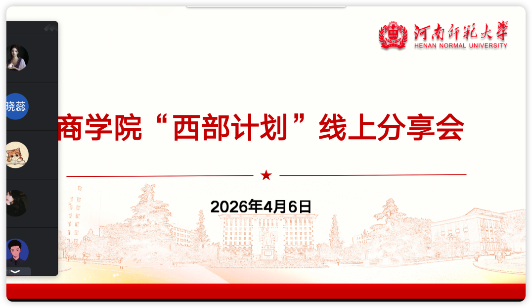 为深入贯彻落实国家关于引导高校毕业生服务基层、投身西部的决策部署,进一步强化就业育人实效,激励青年学子将个人理想融入国家发展大局,4月7日下午,商学院依托腾讯会议平台开展“西部计划”交流分享会。会议由商学院辅导员杨娜主持。