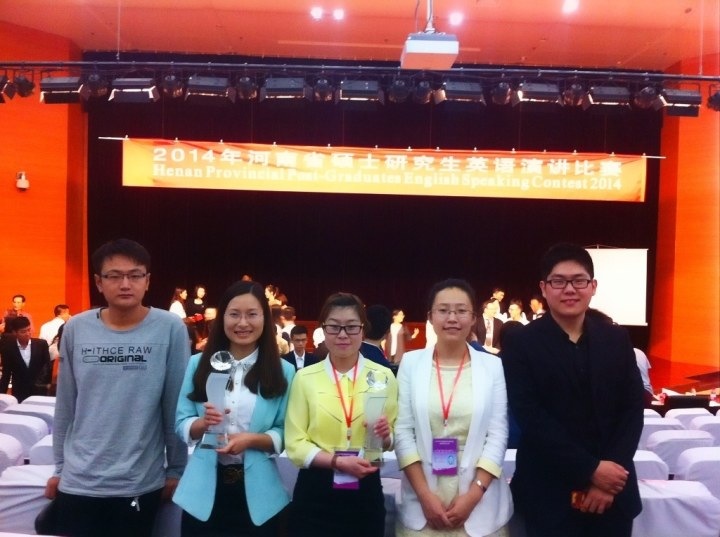 2014年河南省硕士研究生英语演讲比赛于5月9日—10日在河南大学举行。本次比赛共有来自我省20多所高校75名非英语专业硕士研究生参加。我院共3名选手参赛并都取得了优异成绩,靳亚楠同学荣获一等奖,郭晓敏同学获二等奖,万朝阳同学获三等奖。