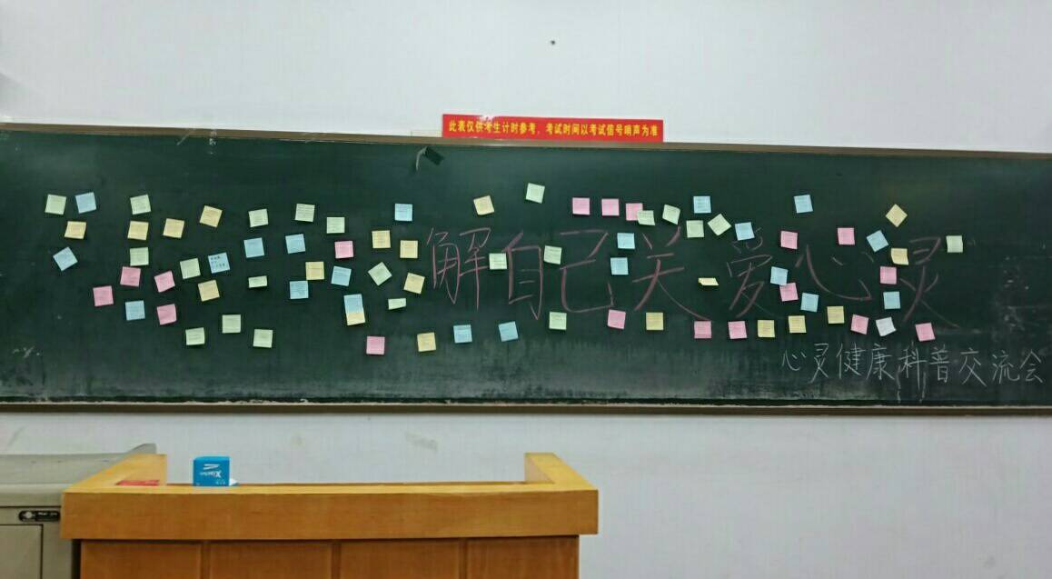会议开始,心理部负责人通过列举与心理问题相关的典型案例为同学们介绍了六种大学生常见的心理疾病,并邀请现场同学上台分享有关心理健康问题的经历和解决方法。其中,李凤婷同学的发言尤为深刻,台下掌声不断。分享结束后,进入有奖竞答环节,同学们热情参与,抢答激烈,在一问一答中普及心理知识。随后,会议播放了有关抑郁症的《心理访谈》视频,台下同学认真观看。最后,同学们在便利贴上写上了自己的感想与祝福,并贴在活动教室的黑板上进行分享展示。
