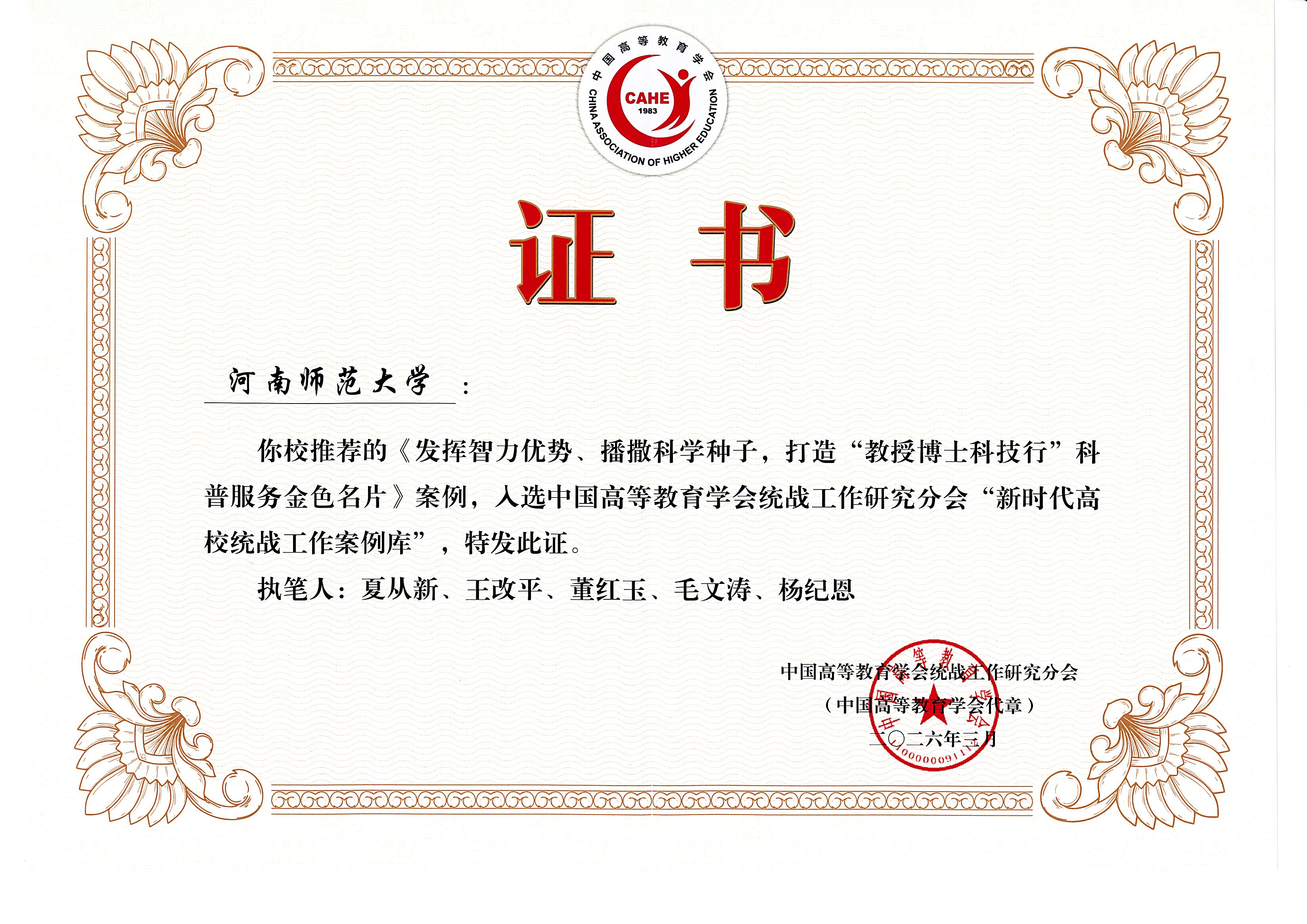 近日,由教育部思想政治工作司指导、中国高等教育学会统战工作研究分会组织开展的“新时代高校统战工作创新案例征集活动”公布入选名单。经各校申报、专家评审及公示,全国共有60个案例入选。我校报送的《发挥智力优势、播撒科学种子,打造“教授博士科技行”科普服务金色名片》成功入选。