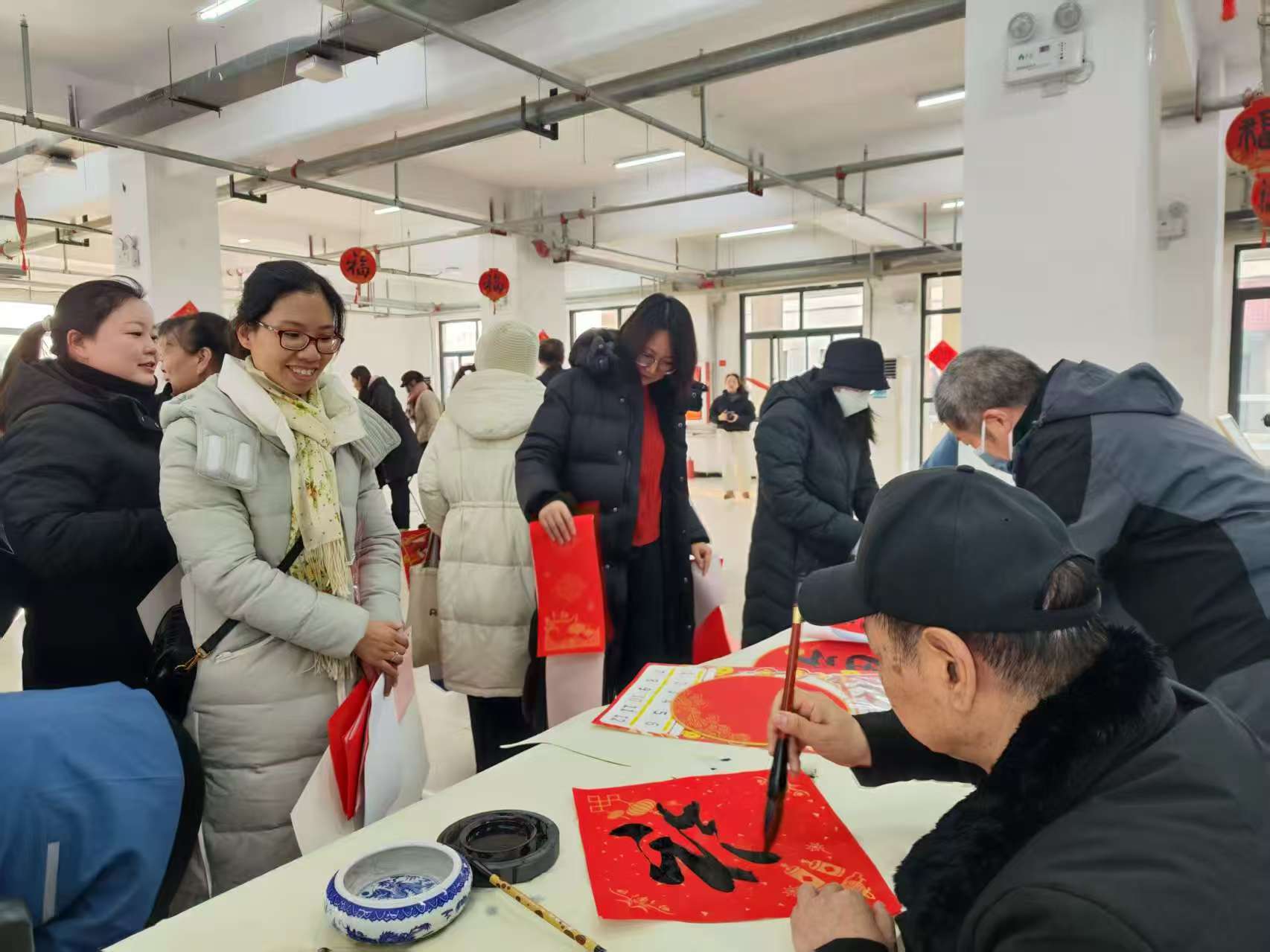 现场暖意融融、墨香四溢。福字斗方贴满角落,福字挂饰高高挂起,红色联纸整齐铺展,砚中墨汁充盈饱满,喜庆的氛围感染着每一位到场人员。老中青三代教职工书法爱好者齐聚一堂,以笔为媒、以墨传情,他们将对学校发展的殷殷希望、对教育事业的深厚情怀与马年期许融入笔端,融入一幅幅饱含深情的春联与福字中,为全校教职工送上最真挚的新春祝福。前来领取春联的老师络绎不绝。大家或驻足观赏书法创作的精妙过程,或轻声交流心仪的联句,脸上洋溢着喜悦与幸福。更有不少人拿出手机记录下这墨香满溢的温馨瞬间,定格校园里的新春暖意。