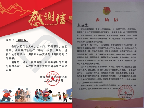 近日,生命科学学院2020级生物与医药专业研究生吴晓敏收到新乡市青年志愿者协会发来的感谢信,对她在新乡市防汛防灾中践行的志愿精神以及危急时刻的挺身而出表示感谢;2019级生态学专业焦聪慧收到共青团获嘉县委的表扬信,以感谢她在“暑期社会实践活动”中的勇于担当与突出表现。据不完全统计,学院共有377名学生参加抗洪救灾和疫情防控志愿活动,其中有54人收到表扬信或者荣誉证书。表扬信和荣誉证书充分肯定与赞扬了院学生在参与防汛与防疫工作中的无私无畏,他们用青春之力汇聚磅礴力量,获得当地人民的好评。