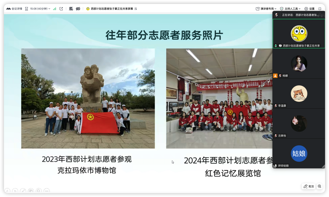 为深入贯彻落实国家关于引导高校毕业生服务基层、投身西部的决策部署,进一步强化就业育人实效,激励青年学子将个人理想融入国家发展大局,4月7日下午,商学院依托腾讯会议平台开展“西部计划”交流分享会。会议由商学院辅导员杨娜主持。