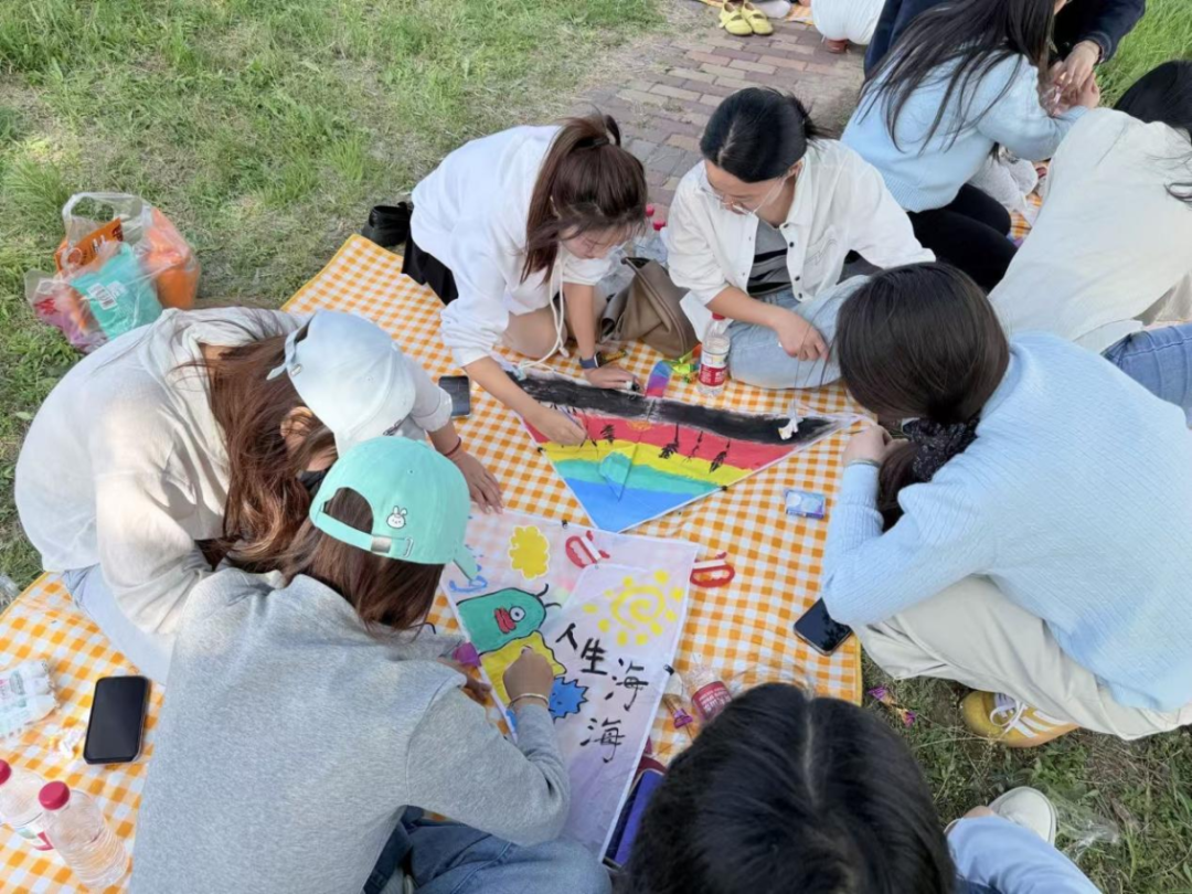 活动伊始,进入风筝制作与彩绘环节。各小组通力协作,在空白风筝上尽情挥洒创意。画笔与颜料交错间,创意与笑声齐飞:有的小组描绘了航天员与火箭,用画笔致敬中国航天科技;有的画出了各种各样的情绪,在风筝上尽情“放飞心情”;还有同学别出心裁地画上了西瓜,为春日增添了几分俏皮与趣味。空白风筝很快化身为承载梦想与情怀的独特画布。