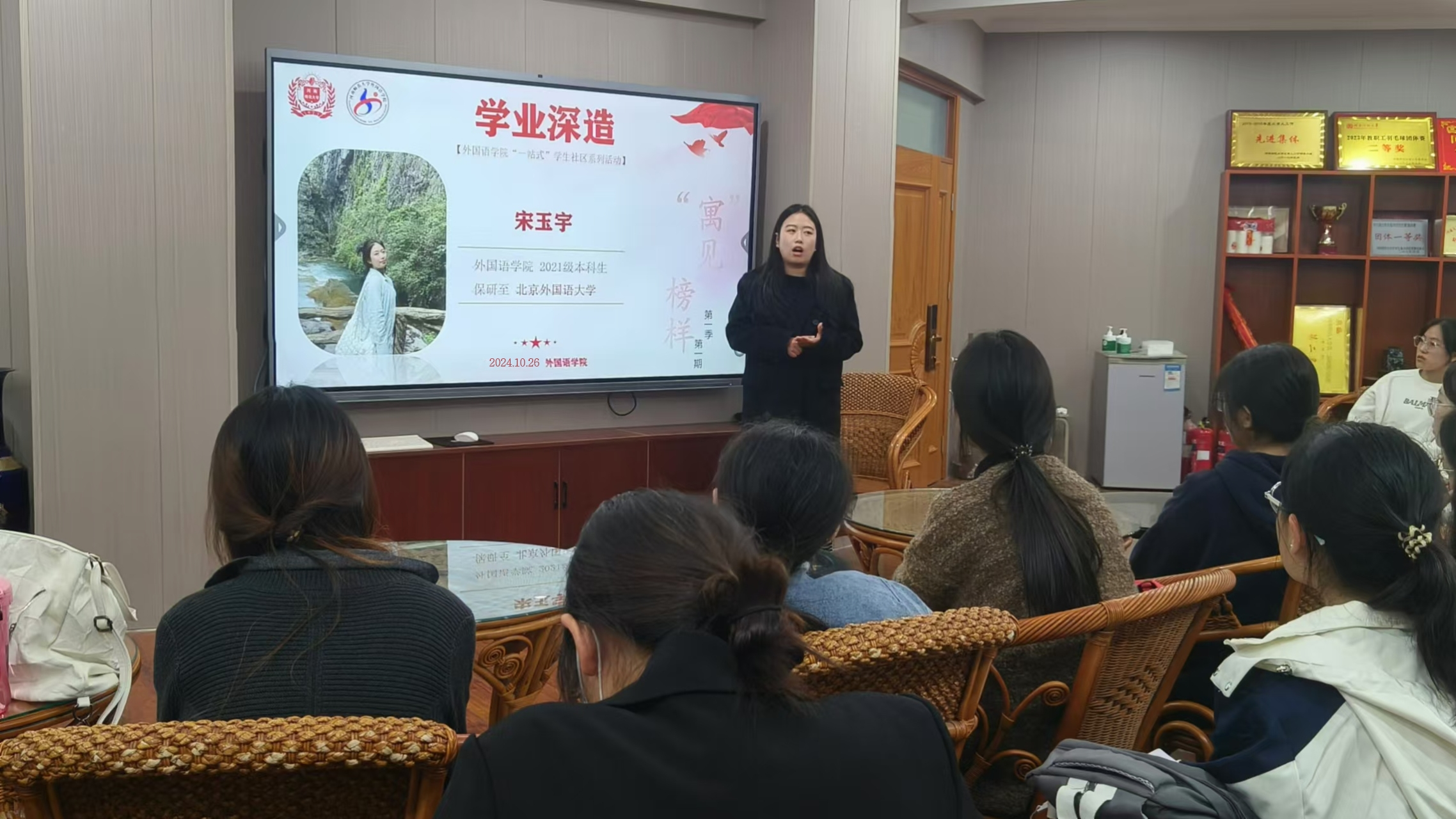 金秋送爽,丹桂飘香。榜样引领,梦想启航。为促进学生社区建设与学风建设、职业规划有机融合,为学生学业赋能、解困纾难,助力学生成长成才。10月26日晚,外国语学院成功开展“寓”见榜样系列活动第一季第一期,本次活动紧紧围绕学业深造这一核心主题。专职辅导员郭倩倩及六十余名学生代表参加活动。 本次活动聚焦保研升学和学科竞赛,特邀学院2021学生推免学生宋玉宇同学,该生综合测评、学业成绩连续三年位居专业第一,多次荣获国家奖学金、“三好学生标兵”等称号,在专业竞赛舞台上拿下多项国家级和省级奖项。活动中,宋玉宇分享了自身的保研经验和学习心得。她强调要特别注意自己的绩点、英语成绩、多参加一些竞赛科研比赛丰富自己的经验和阅历。要提前锻炼好自己的口语能力,了解各大夏令营的信息,避免信息闭塞;积极参加学院工作、学好专业课知识、积极参加实践活动,不断锻炼听说读写技能,提升专业能力和核心竞争力。活动最后,郭倩倩老师也寄语在场学生要积极参与“寓”见榜样系列活动,汲取榜样力量,赋能个体成长。 未来,外国语学院将持续开展“寓”见榜样系列活动,从学生们关注的学业发展、职业规划、实践实习等方面组织相关活动,搭建优秀学子与低年级同学之间的沟通桥梁,完善朋辈育人体系,为学生提供一个充满活力、充满机遇的成长环境,助力学生全面发展。 (外国语学院 郭倩倩 孙涵雯 责任编辑 陶雨彤) |