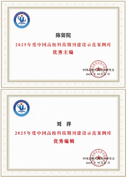 11月6日至9日,中国高校科技期刊研究会第29次年会在西安市召开。会上公布了“2025年度中国高校科技期刊建设示范案例库·编辑团队及编辑个人案例”的评选结果,我校学报陈留院编审入选“2025年度中国高校科技期刊建设示范案例库·优秀主编”,刘洋副编审荣获“2025 年度中国高校科技期刊建设示范案例库·优秀编辑”。