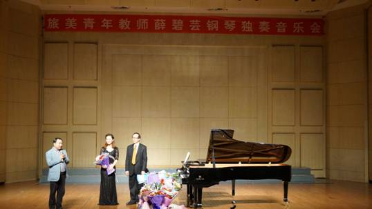 由河南省音乐家协会钢琴专业委员会主办,5月21日19时30分,我校音乐舞蹈学院旅美青年教师薛碧芸钢琴独奏音乐会在河南师范大学音乐厅成功举办。本次音乐会由钢琴教研室主任杨芳老师主持,音乐会的现场还特别邀请了著名美籍华裔钢琴家、作曲家孙以强教授出席并协奏演出贝多芬c小调第三钢琴协奏曲。音乐舞蹈学院院长段续莅临音乐会并致辞。 音乐会分为三个篇章。第一篇章巴赫的bB大调前奏曲与赋格,前奏曲的轻快与赋格的安谧形成对比,使听众忘记了所有的烦恼与不快只留下心的平静与享受;第二篇章门德尔松的d小调庄严变奏曲,技巧与情感的完美结合诠释了作品的魅力;第三篇章薛碧芸老师特邀孙以强教授协奏,共同合作演绎贝多芬的c小调第三钢琴协奏曲。c小调第三钢琴协奏曲中活泼的快板展示了宏伟的华彩乐段;缓板满载动人遐思之气氛,奏出圣歌之味道;回旋曲-快板慷慨激昂,钢琴以八度音尽显超凡技巧,再现趣味盎然之情调。二人默契的配合、高超的技巧,完美诠释了音乐的魅力,把晚会推向了高潮。最后,在经久不息的掌声中,音乐会划上了完美的句号。 出席音乐会的领导和专家:新乡市音乐家协会主席胡新华,新乡市摄影家协会副主席王国胜及音乐舞蹈学院陈俊杰书记、段续院长等各位领导和老师。 音乐舞蹈学院 董雪雯 王圆