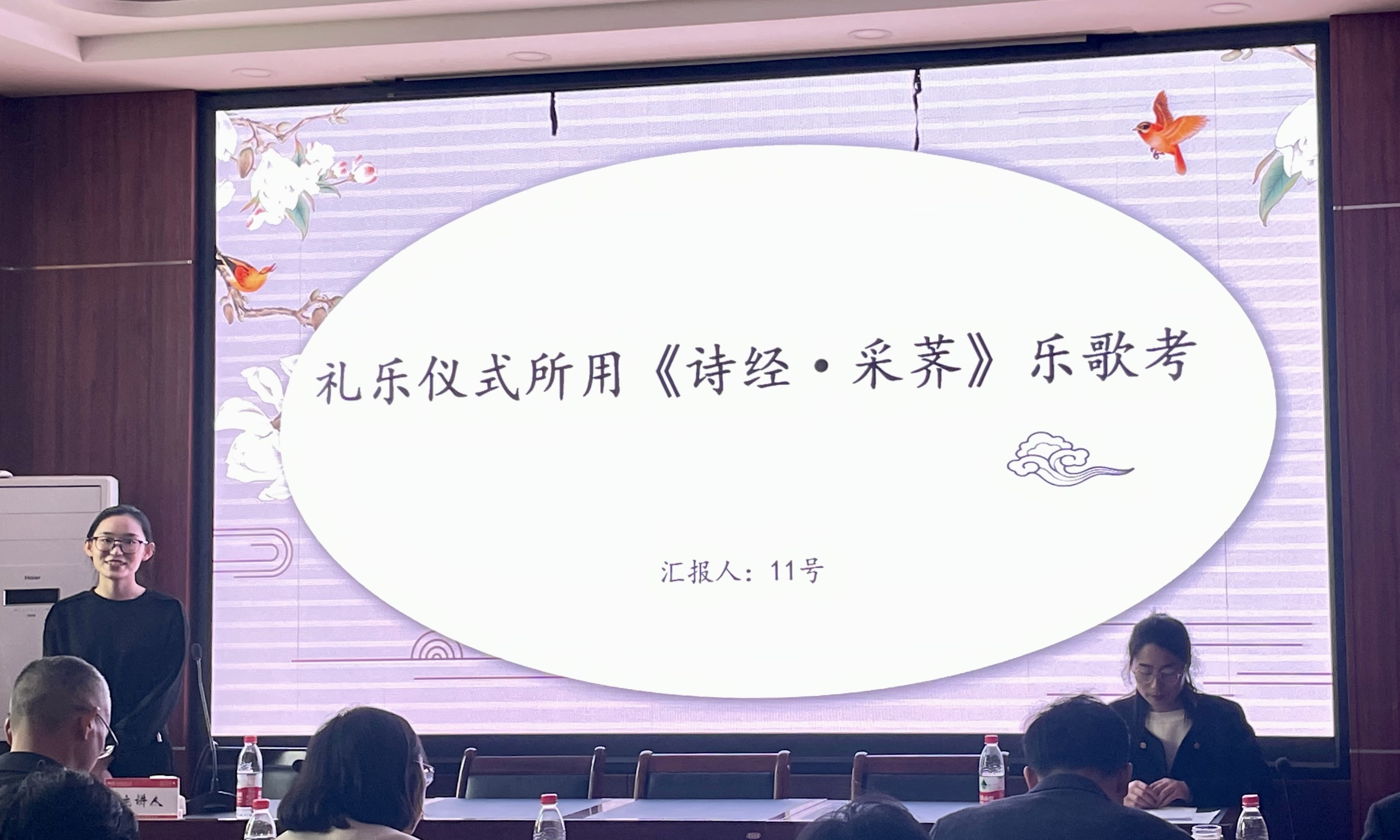 我院根据学校工作安排,认真组织、精心准备,经过学院层层选拔,安排专业导师辅导,推选贾舒雨参加校级硕博论坛。该生以《礼乐仪式所用〈诗经·采荠〉乐歌考》为题,通过详实的史料梳理、严密的论证呈现、清晰的观点阐释,探究历代宫廷仪式中《诗经》乐歌——《采荠》的使用情况及社会意涵。该生在答辩过程中系统的阐述了论文的学术性、规范性与创新性,逻辑严谨、论证充分,凭借扎实过硬的专业素养和大方得体的言谈举止,获得现场评委们的一致好评,最终取得优异成绩。