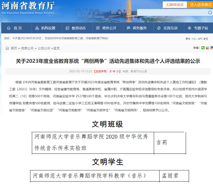 近日,河南省委高校工委、河南省教育厅公布了2023年度全省教育系统“两创两争”先进集体和先进个人评选结果,我院2020级中华优秀传统音乐传承实验班获评“河南省文明班级”、2021级研究生孟丽君获评“河南省文明学生”。