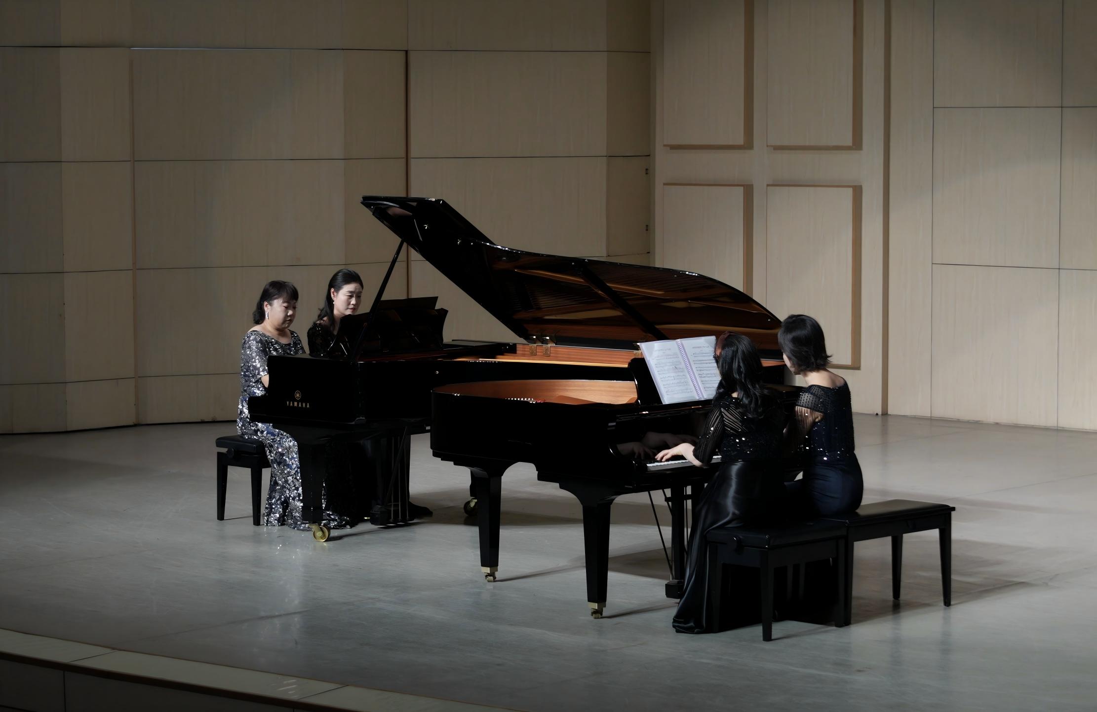 音乐会在双钢琴《一步之遥》《节奏律动》的深情旋律中拉开帷幕,优雅的探戈节奏预示着艺术追求永无止境。随后的德沃夏克《斯拉夫舞曲》热烈奔放,展现了音乐与人民生活的紧密相连。肖邦《c小调夜曲》Op.48 no.1的独奏段落,深刻而内省,体现了教师个人深厚的艺术积淀。肖斯塔科维奇《第二钢琴协奏曲》第一乐章以其青春昂扬的朝气,奏响了个人与时代同行的奋进之歌;而肖斯塔科维奇《双钢琴协奏曲》则以其精巧的现代构思,展示了艺术风格的多元探索。肖邦《第二奏鸣曲》第一乐章的庄严奏响,恰如伟大征程的铿锵宣言。李斯特《梅菲斯托圆舞曲》带我们进入了光怪陆离、充满诱惑的世界。达律斯·米约的双钢琴作品《胆小鬼》以幽默戏谑的笔触,展现了艺术的活力与锐气。最终,音乐会在韦伯《邀舞》的八手联弹中达到高潮,四位教师同台,手在琴键上飞舞,将“和声与共”的主题演绎得淋漓尽致,象征着全院教师同心同德、携手育人的坚定信念,赢得了全场经久不息的热烈掌声。