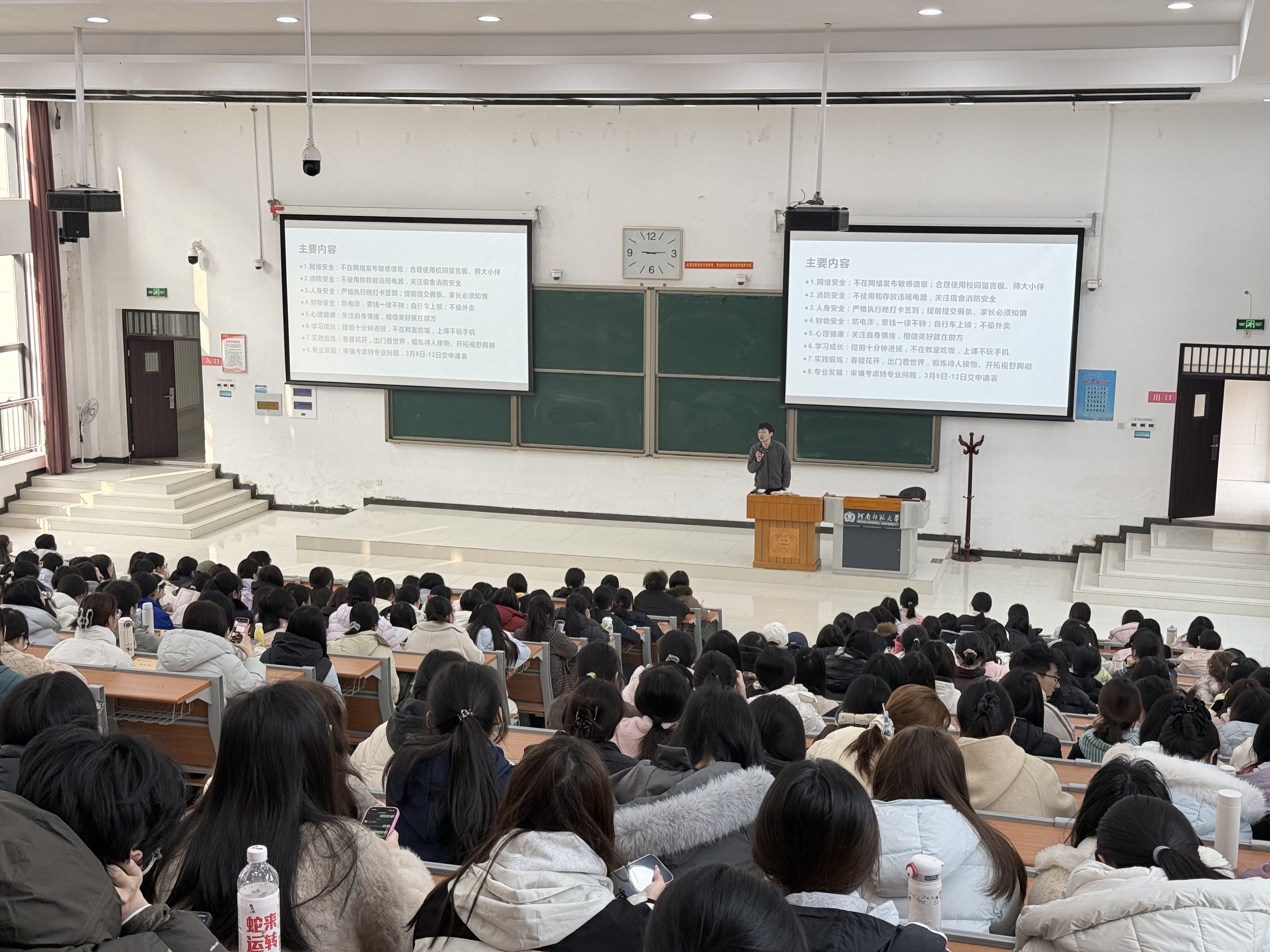 会上,张永欣首先强调了校园安全的重要性,从多个维度提出具体要求:网络安全方面,提醒学生不发布敏感信息,合理使用校园留言板等平台;消防安全方面,严禁使用和存放违规电器,时刻关注宿舍消防安全;人身安全方面,严格执行晚打卡签到制度,离校需提前提交假条并确保家长知情;财物安全方面,重点防范电信诈骗,牢记“要钱一律不转”。在学习成长方面,张永欣提出具体规范,倡导同学们端正学习态度,营造良好学风。他鼓励大家利用春暖花开的时节走出校园,积极参与实践锻炼。此外,他还关注学生心理健康,鼓励大家关注自身情绪,保持积极心态,相信“美好就在前方”。