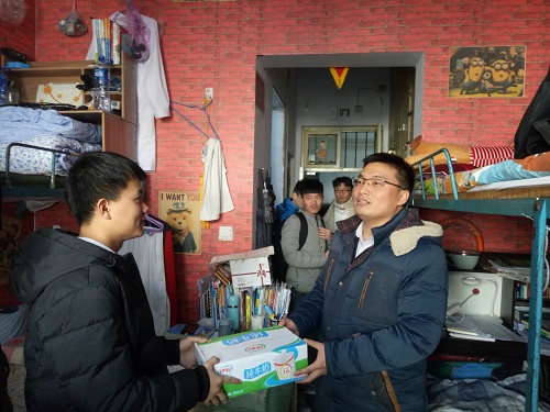 送岗位、送技能、送车票、送棉衣棉被及爱心大礼包等多样形式,为帮扶增添了一道亮丽风景线。生命科学学院、马克思主义学院、计算机与信息工程学院积极举办“情暖青春”爱心帮扶活动,充分发挥共青团优势,为困难学生办实事、做好事、解难事,通过整合社会捐助新资源,开辟资助新渠道,加大资助力度,让家庭贫困的同学能够温暖过冬。化学化工学院团委书记卢鑫为了帮助新入校的小“17”们安心备考,减轻心理压力,特意为他们送去了爱心牛奶,并在网上迅速传播,卢鑫老师也因此成了“网红”,被学生们亲切地称为“超级奶爸”,受到了新乡电视台、《平原晚报》的关注报道。