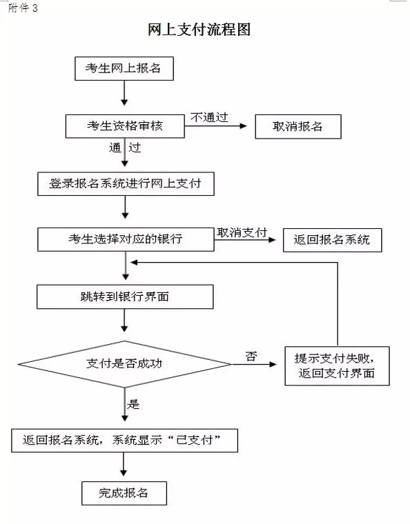 第九步:网上缴费。网上审核通过后,在网上缴费截止日期前,考生再次登录网上报名系统,按照系统提示进行在线支付考试费,缴费完成即为报名成功。逾期不缴费的考生视为放弃报考。(见附件3