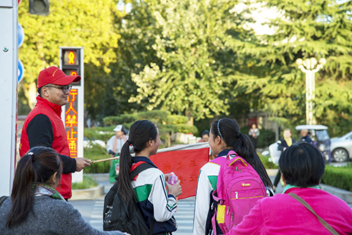 活动现场,志愿者身着统一服装,手持文明出行劝导旗,在斑马线处重点对过马路的行人进行劝导,引导他们遵守交通规则,敢于对身边的不文明行为进行劝导,努力培养行人文明出行意识,致力于构建安全、畅通、和谐、文明的交通环境。