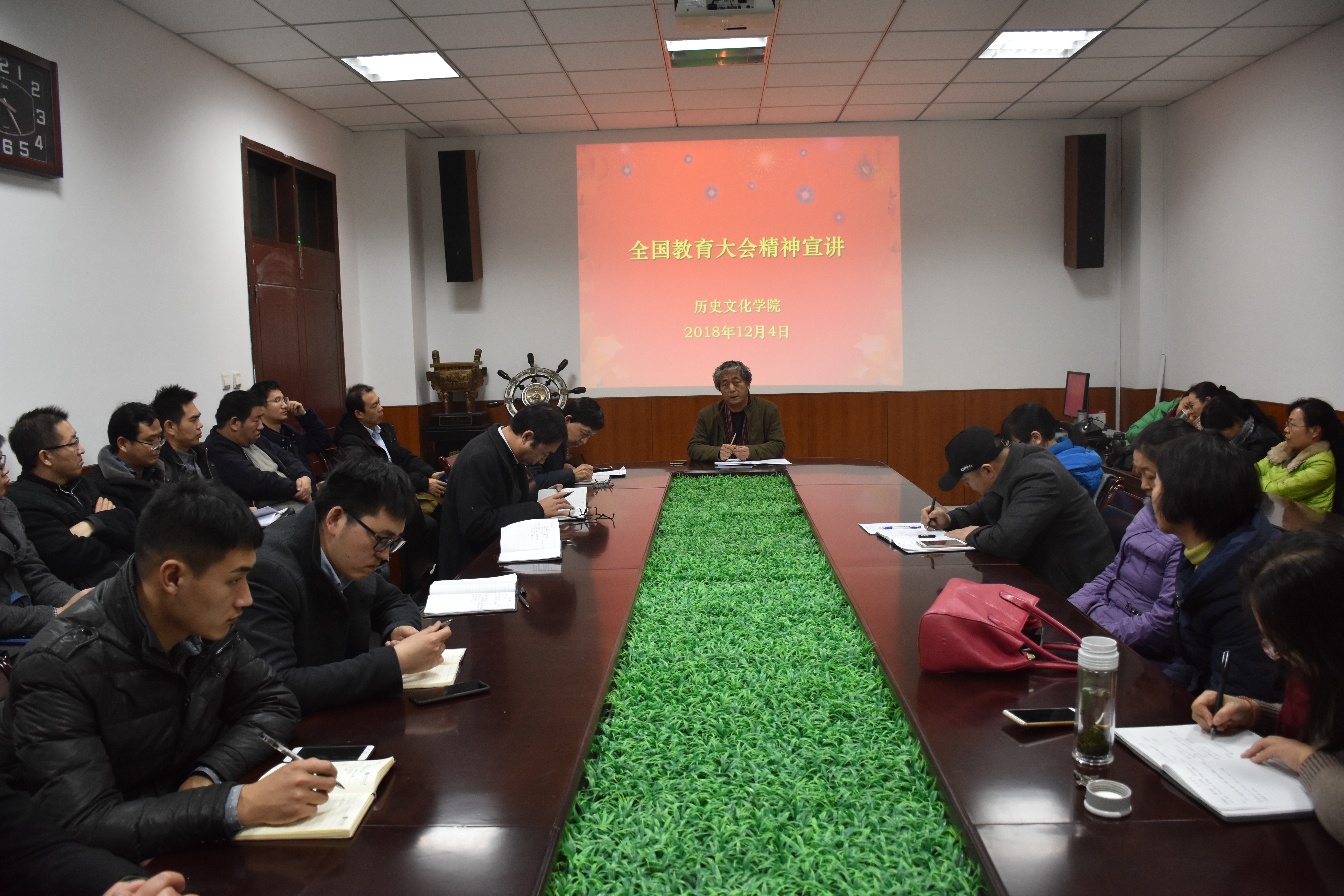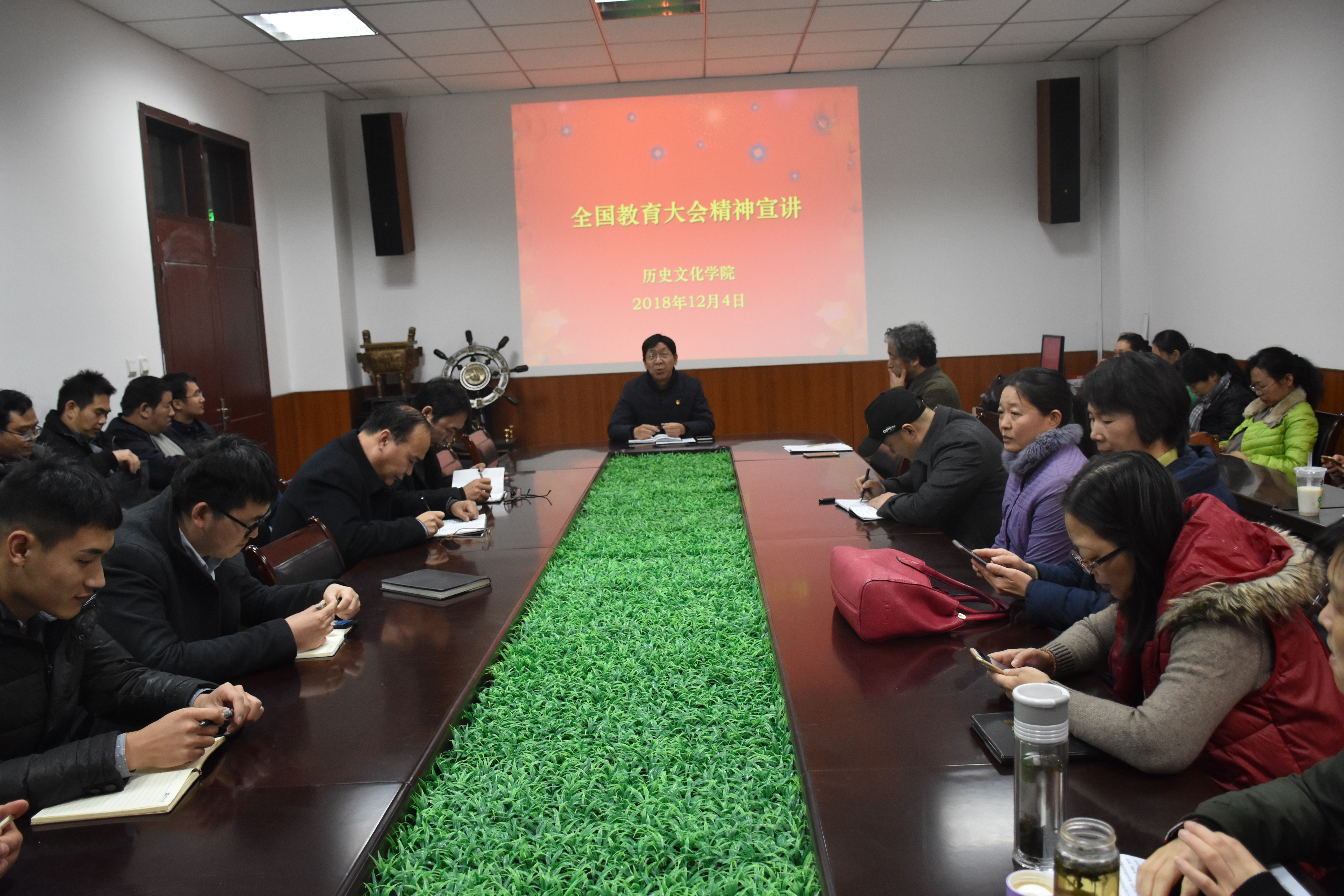 为深入学习贯彻习近平总书记在全国教育大会上的重要讲话精神,切实把思想和行动统一到党中央决策部署上来,12月4日下午,历史文化学院在学院二楼会议室举行全国教育大会精神宣讲会。学院党委书记巨永明、院长苏全有面向全院教师全面系统地解读了全国教育大会精神,并紧密结合学院实际,部署贯彻落实工作。