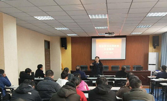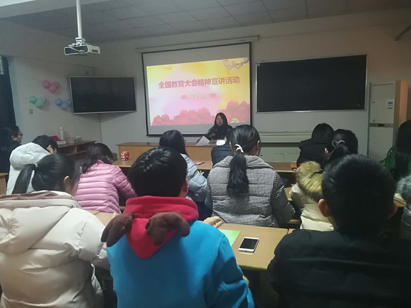 王晓东对全国教育大会精神进行了宣讲,他说,2018年9月10日在北京召开的全国教育大会,是一次举国上下学习贯彻习近平新时代中国特色社会主义思想和党的十九大精神的会议,是在决胜全面建成小康社会关键时期召开的一次特别重要的大会。他强调,在党的坚强领导下,全面贯彻党的教育方针,坚持马克思主义指导地位,坚持中国特色社会主义教育发展道路,坚持社会主义办学方向,立足基本国情,遵循教育规律,坚持改革创新,以凝聚人心、完善人格、开发人力、培育人才、造福人民为工作目标,培养德智体美劳全面发展的社会主义建设者和接班人,加快推进教育现代化、建设教育强国、办好人民满意的教育。此次大会强调了教育改革发展的“九个坚持”,明确了一个“根本任务”,要在“六个方面”下功夫,要围绕立德树人培养目标开展工作,要坚决克服五个“唯”,着重培养“三种人才”,家庭做好“四个一”。