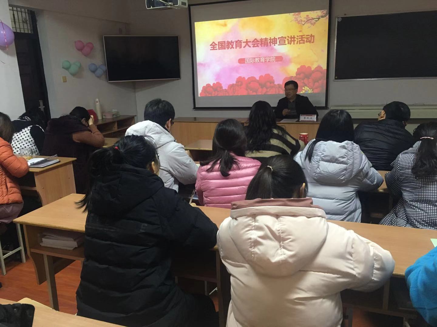为深入学习贯彻习近平总书记在全国教育大会上的重要讲话精神,按照学校工作部署,12月11日下午,国际教育学院党总支书记李秋发和院长陈运香就大会精神分别进行了专题宣讲。学院全体职工和部分学生代表参加了本次活动。