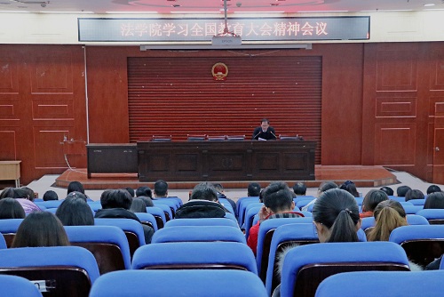 12月4日下午,法学院院长王鹏祥在模拟法庭为全体教师和学生代表宣讲全国教育大会精神。法学院全体教师、部分学生代表200余人齐聚一堂,共同聆听了这场生动而详实的报告。