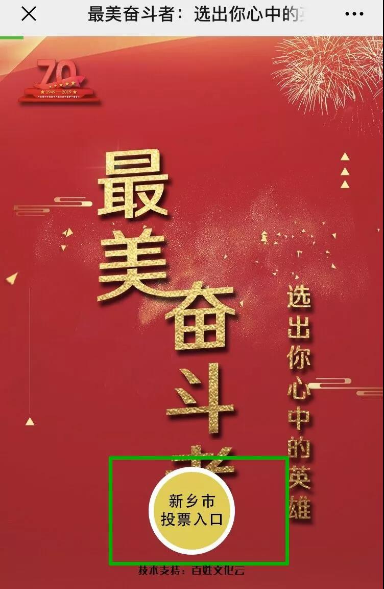 为庆祝中华人民共和国成立70周年,中共中央宣传部在全国举办“最美奋斗者”评选活动。新乡市有4名先进典型入选“最美奋斗者”候选人(河南省20人入选)。请通过新乡市专属入口为“最美奋斗者”候选人(新乡市有史来贺、吴金印、裴春亮、李江福四位候选人)和其他候选人投票,为“出彩河南人”喝彩。具体操作流程如下: