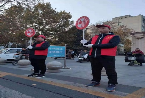 迎着早晨的太阳,伴着落日的余晖,执勤小分队成员一个个穿着红马褂、头戴红帽、手持引导牌,形成一道靓丽的风景线。为维护同学们上下学期间的安全,志愿者们及时配合交警人维护正常的交通秩序,引导车辆礼让行人,帮助过往学生安全有序地通过斑马线。