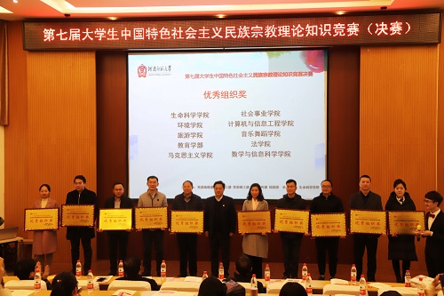 颁奖仪式上,党委常委、统战部长张进江宣读获奖名单。在第七届大学生中国特色社会主义民族宗教理论知识竞赛暨主题征文活动中,共有35名选手获得竞赛个人奖;100名学生获得征文奖;3个团体一等奖、5个团体二等奖、14个团体三等奖;10个学院获得优秀组织奖。现场领导为获奖学院和学生颁发奖牌和证书。