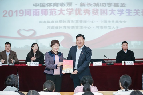 王海新指出,“中国体育彩票•新长城助学基金”是一项支持党的教育事业更好发展的公益助学项目,也是一项以实现“教育强国”为宗旨的青年大学生帮扶项目。助学项目一方面帮助优秀困难学生减轻家庭负担,顺利完成学业,另一方面也帮助学生树立坚强刚毅、自信达观的人生态度,勇敢战胜挫折,既要“扶贫”,更要“扶志”,助力学生人生出彩。
