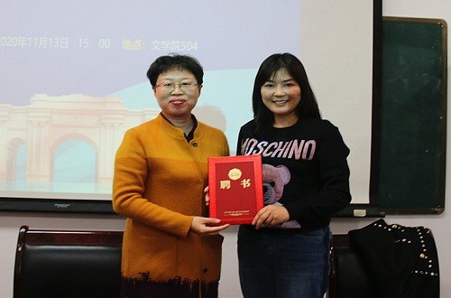 刘霞对学院学生“宝艺斋曲艺文化产品有限公司”“‘绿水青山’益支教工作室”等创新创业项目进行耐心细致指导。随后,学院院长赵黎波为刘霞颁发文学院创新创业项目指导教师聘书,并合影留念。