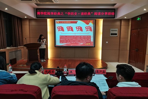 为深入贯彻学习习近平新时代中国特色社会主义思想和党的创新理论,提高自身理论修养,筑牢信仰之基,持续深化爱国主义教育,11月24日晚,商学院在学院楼119会议室举行“学四史,读经典”阅读分享活动。学院相关负责人及2017级、2018级和2019级辅导员参加此次活动并担任评委,学院12名优秀同学参加了此次比赛。