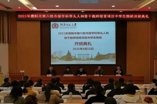 4月13日上午,2021年濮阳市第六批市级学科带头人和骨干教师培育项目中学生物班开班仪式在我校生命科学学院报告厅举行。副校长郭海明,濮阳市教育局副局长乔明福以及我校继续教育学院、生命科学学院培训负责人出席。开班仪式由继续教育学院院长李津主持。