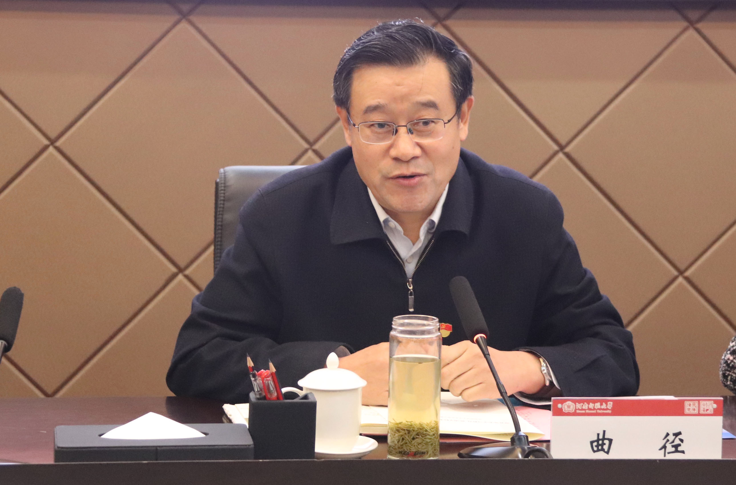 10月21日上午,省委党史学习教育第六巡回指导组一行到我校开展第二轮集中巡回指导,汇报会在勤政楼第三会议室举行。第六巡回指导组组长、省文旅厅党组成员、副厅长曲径,副组长、省纪委驻审计厅纪检组二级巡视员索俊玲及指导组其他成员,校领导赵国祥、常俊标、陈广文、梅宪宾、李雪山、张尚字、郭海明出席会议。学校党史学习教育领导小组全体成员参加汇报会。会议由校长常俊标主持。