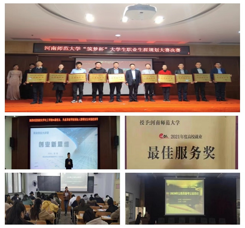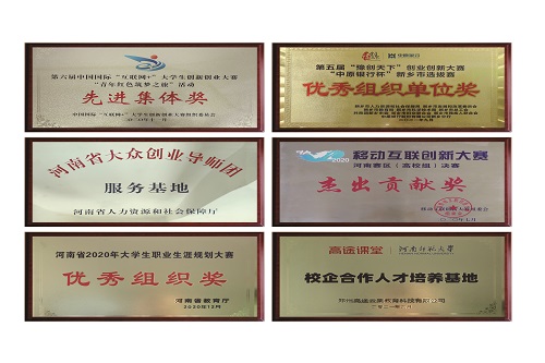 学校多次获得“河南省普通大中专毕业生就业创业工作先进单位”荣誉称号。特别是近几年来,学校先后获评“河南省大众创业导师团服务基地”“深化创新创业改革示范校”“高校就业最佳服务校”等荣誉称号;学校在第二至第七届中国“互联网+”大赛中,共获得国家级3银11铜,省级23金49银72铜的好成绩,学校多次获得优秀组织奖,特别是在2020第六届“互联网+”全国总决赛中获“先进集体奖”(全国共29所高校获评),是本届大赛河南省内唯一获此殊荣的高校。2人获河南省教学技能大赛二等奖、1人获得河南省科普成果奖,10余人获评河南省就业指导名师、3人获得河南省青少年科技创新奖;2人获评全国就业宣传先进个人;30余人获评创新创业大赛优秀指导教师。