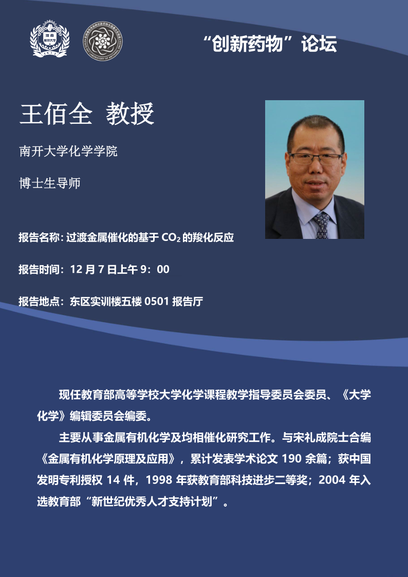 南开大学王佰全教授将应邀做客百年校庆之“创新药物”讲坛