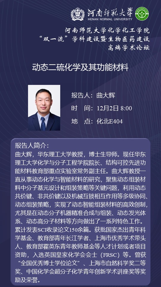 华东理工大学曲大辉教授将应邀做客百年校庆之“俊甫”讲坛