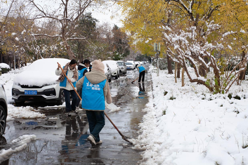 大家不顾严寒,带着铁锹、扫帚等清雪工具清理积雪。道路两旁花丛中,教学楼前的道路上,志愿者们蓝色的身影在校园中穿梭,不放过一片落雪,成为校园一道靓丽的风景线。经过近两个小时的清雪工作,路面上的积雪被清扫一空,为师生们提供了安全可行的畅通之路。志愿者们纷纷表示,参加积雪清扫活动在锻炼自己身体的同时又充满乐趣,既为校园文明建设贡献力量,又能够从劳动中收获快乐。