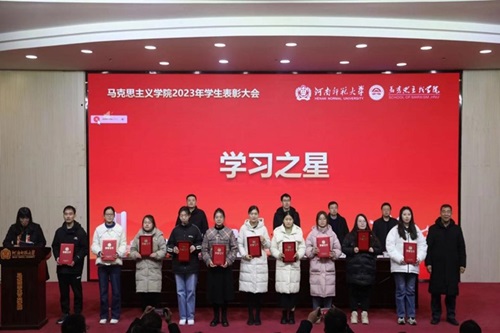 表彰大会在国歌声中拉开帷幕。副院长曲嘉宣读优秀集体与优秀个人表彰决定,并向所有受表彰的同学表示祝贺。获得优秀宿舍、优秀宿舍长、优秀学生干部、优秀宣讲员、优秀时政评论员、优秀口述史调研员、社团之星、宣传之星、志愿之星、文体之星、创新之星、学习之星的学生(集体)依次上台领奖。颁奖环节结束后,22级马克思主义理论专业谢筠、21级思想政治教育专业二班雷淑文和陈卓、22级马克思主义理论专业硕士研究生李妍霏、22级马克思主义理论专业博士研究生李倩倩作为学生代表发表获奖感言,他们表示,作为马院学子,要志存高远、脚踏实地,找到自己的热爱与追求,明确自己的使命和担当,使自己的大学生活充实而有意义,更好地走向社会、报效国家。