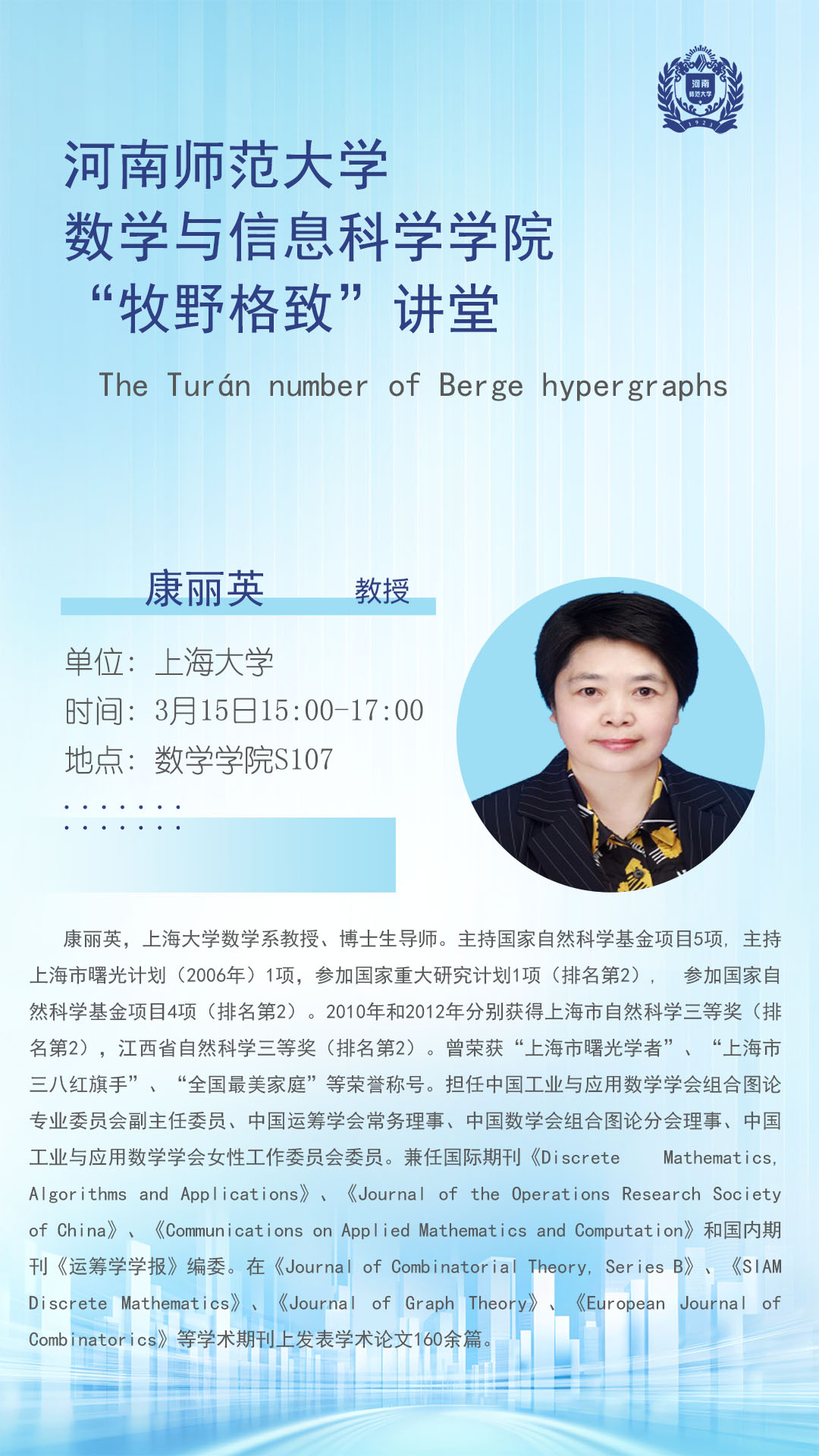 上海大学康丽英教授将应邀做客“牧野格致”讲堂