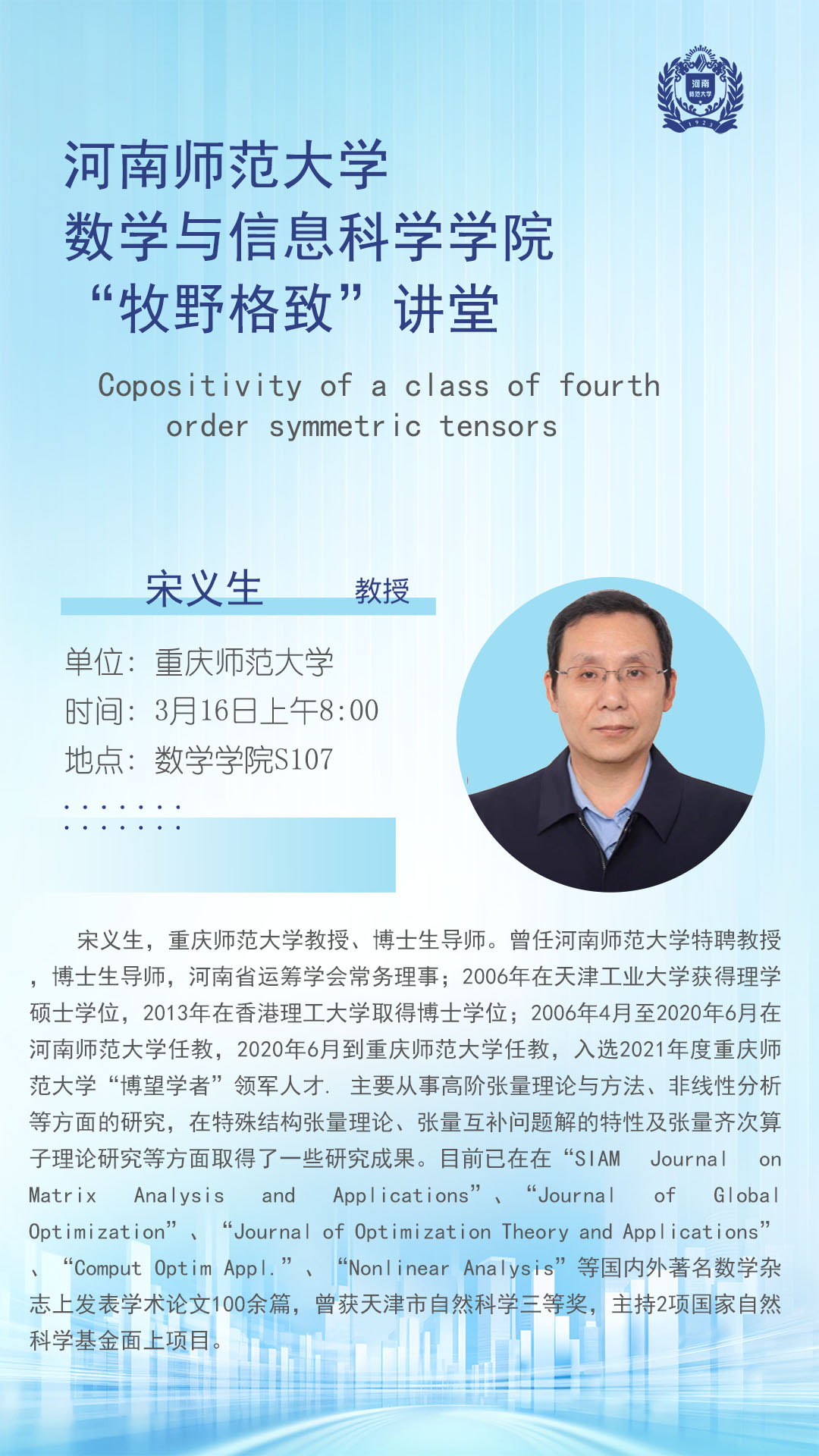重庆师范大学宋义生教授将应邀做客“牧野格致”讲堂