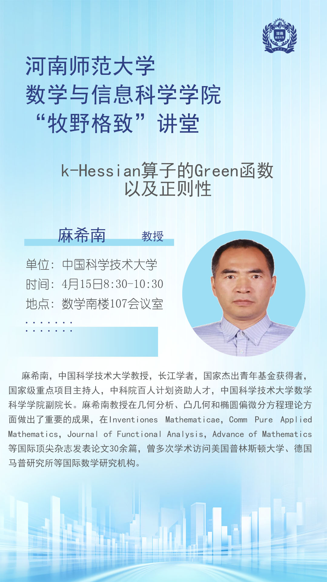 中国科学技术大学麻希南教授将应邀做客“牧野格致”讲堂
